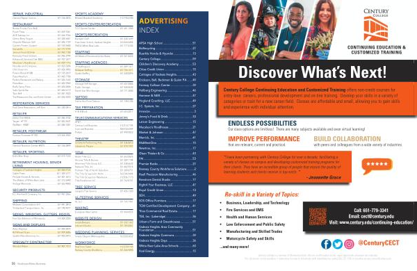 AFSA High School ...................................... 51 BizRecycling ............................................... 27 Buerkle Honda & Hyundai ......................... 13 Century College ......................................... 59 Children ’ s Discovery Academy .................. 53 Cities Credit Union .................................... 15 Cottages of Vadnais Heights ..................... 43 Erickson , Bell , Beckman & Quinn P . A ........ 49 Fairway Collison Center ............................. 39 Hallberg Engineering ................................. 46 Hammer & NER ......................................... 47 Hoglund Coaching , LLC ............................. 49 I . C . System , Inc .......................................... 27 Innovize ........................................................ 3 Jimmy ’ s Food & Drink ............................... 33 Larson Engineering .................................... 15 Macaluso ’ s Roadhouse ............................... 21 Market & Johnson ..................................... 47 Merrick , Inc ................................................ 41 MidWestOne .............................................. 15 Newtrax , Inc ............................................... 17 Olsen Thielen & Co .................................... 43 PAI .............................................................. 53 Premier Banks ............................................ 27 Ramsey County Workforce Solutions .......... 2 Reell Precision Manufacturing ................... 46 Renstrom Dental Studio ............................ 17 Right4 Your Business , LLC ......................... 47 Royal Credit Union ..................................... 13 SEH ............................................................. 49 SOS Office Furniture .................................. 17 TCM Certified Development Company .... 41 Titus Commercial Real Estate .................... 17 TSE , Inc . ( Lakeridge ).................................. 36 Urban ’ s Farm and Greenhouses ................ 51