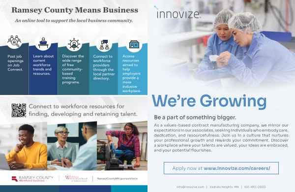Post job openings on Job Connect. Learn about current workforce trends and resources. Discover the wide range of free community- based training programs. Connect to workforce providers through the local partner directory. Ramsey County Means Business An online tool to support the local business community. Access resources aimed to help employers provide a more inclusive workplace. RamseyCountyMN. gov / workforce Post job openings on Job Connect. Learn about current workforce trends and resources. Discover the wide range of free community- based training programs. Connect to workforce providers through the local partner directory. Ramsey County Means Business An online tool to support the local business community. Access resources aimed to help employers provide a more inclusive workplace. RamseyCountyMN. gov / workforce resources. based training programs. local partner directory. employers provide a more inclusive workplace. RamseyCountyMN. gov / workforce