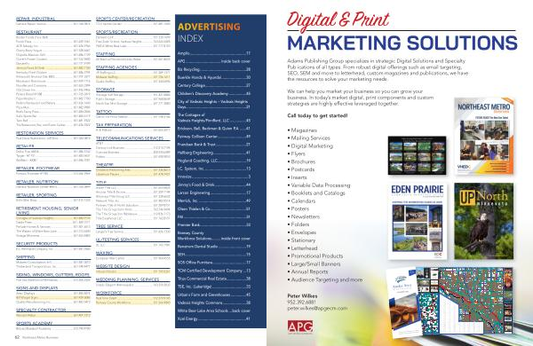 vhedc. com 63 Adams Publishing Group specializes in strategic Digital Solutions and Specialty Publications of all types. From robust digital offerings such as email targeting, SEO, SEM and more to letterhead, custom magazines and publications, we have the resources to solve your marketing needs. We can help you market your business so you can grow your business. In today’ s market digital, print components and custom strategies are highly effective leveraged together. Call today to get started! • Magazines • Mailing Services • Digital Marketing • Flyers • Brochures • Postcards • Inserts • Variable Data Processing • Booklets and Catalogs • Calendars • Posters • Newsletters • Folders • Envelopes • Stationary • Letterhead • Promotional Products • Large / Small Banners • Annual Reports • Audience Targeting and more Peter Wilkes 952.392.6881 peter. wilkes @ apgecm. com Digital & Print MARKETING SOLUTIONS 2025 | destinationupnorth. com 1 2025 Visit us at DestinationUpNorth. com Mall Of America Southdale Mall Fort Snelling National Cemetery Mpls.-St. Paul International Airport( MSP) Fort Snelling Terminal 1 Terminal 2 Veteran’ s Hospital Minnehaha Falls University of Minnesota Augsburg College Williams Arena Marriucci Arena TCF Bank Stadium Blue Line LRT Green Line LRT US Bank Stadium Guthrie Theater Mpls. Institute of Arts St. Mary’ s University Target Center Walker Art Center Renaissance Festival Grounds Canterbury Park Valleyfair MN School Of Business Anoka Ramsey Community College Anoka State Hospital Anoka Co. Tech. College MN School Of Business Crystal Airport Hennepin Tech. College North Hennepin Community College Rasmussen College Rasmussen College St. Mary’ s University Normandale Community College Hennepin Technical College Flying Cloud Airport Rasmussen College Airlake Park Airport Minnesota Zoo Dakota County Technical College Inver Hills Community College Rasmussen College TC Premium Outlets So. St. Paul Municipal Airport Xcel Energy Center St. Paul Downtown Airport( Holman Field) State Capitol CHS Field State Fairgrounds Como Park Zoo National American University Anoka County / Blaine Airport National Sports Center Minnesota Correctional Facility Forest Lake Airport Lakewood Community College Minnesota Correctional Facilities Lake Elmo Airport Coon Rapids Dam St. Mary’ s University Macallister College College of St. Catherine U. of St. Thomas Target Field Burnsville Center Mall Northstar Commuter Rail Mystic Lake Casino & Hotel Red Line Bus Route DAKOTA COUNTY SCOTT COUNTY HENNEPIN COUNTY WRIGHT COUNTY ANOKA COUNTY RAMSEY COUNTY WASHINGTON COUNTY CARVER COUNTY SAINT CROIX COUNTY PIERCE PIERCE COUNTY POLK POLK COUNTY Minnesota Wisconsin Minnesota Wisconsin Minnesota Wisconsin 50 70 8 8 8 8 81 64 64 89 89 37 5 46 46 50 60 32 38 32 32 5 73 28 56 56 24 26 26 31 31 31 31 31 31 78 78 27 64 9 9 9 9 2 2 2 85 23 2 2 2 61 61 62 62 58 26 28 43 43 63 14 6 4 8 8 73 63 63 71 71 38 32 11 11 5 38 38 42 42 46 46 85 85 85 46 47 89 47 47 83 91 91 91 91 76 76 89 85 85 89 54 68 68 62 62 66 66 62 81 81 72 72 50 50 50 74 79 48 33 73 42 42 42 21 78 19 75 38 39 74 19 19 17 17 15 15 15 15 53 52 1 2 2 2 83 34 50 50 15 14 24 23 5 11 VV V V E E A UU FF F F F MM FF QQ MM M I 11 5 55 55 55 59 15 65 10 10 76 20 22 13 13 13 13 35 36 9 9 58 57 57 8 4A 4 4 4 4 7 8 7 7 61 51 7 3 3 3 12 6 20 18 18 18 71 71 21 21 21 28 87 42 42 18 16 16 83 83 82 81 12 101 101 69 15 10 10 10 10 10 10 155 10 15 17 17 18 18 43 43 117 14 14 1 1 1 1 32 1 4 69 78 79 17 14 14 17 73 42 46 46 75 27 27 27 27 56 87 62 84 10 10 10 79 79 79 70 15 15 15 15 54 64 64 64 64 59 66 66 57 9 64 40 40 52 53 53 53 51 40 43 43 41 41 45 45 50 50 51 51 32 151 30 30 30 30 20 6 17 17 16 16 30 106 13 13 6 6 6 73 90 92 92 110 125 110 26 26 90 92 92 92 10 10 10 30 30 123 117 203 19 19 19 19 24 24 9 101 101 101 5 3 4 62 62 3 3 5 20 158 25 152 152 42 48 5 73 17 31 22 22 3 1 31 53 32 52 52 35 35 35 33 46 17 28 34 17 101 16 9 70 19 151 19 19 44 19 83 50 50 50 11 11 115 115 118 201 127 24 24 15 15 15 51 135 146 84 10 27 153 153 153 140 36 140 140 111 152 11 11 110 11 11 11 40 40 11 11 7 7 3 3 52 11 5 5 5 6 6 1 1 60 53 53 55 64 68 68 87 44 21 21 23 81 21 91 91 91 23 23 23 80 80 17 84 80 80 80s 80n 80 78 23 23 23 86 90 96 47 47 59 59 94 88 88 88 83 83 86 86 96 86 53 51 79 30 30 73 3 117 150 116 159 81 81 81 81 57 81 103 30 103 103 109 109 130 130 61 61 61 60 39 60 61 61 61 130 152 152 116 37 36 36 39 39 39 18 117 117 119 119 35 35 134 35 113 18 37 37 131 39 75 50 11 11 73 4 4 48 48 67 23 16 67 73 81 81 11 19 19 20 120 144 33 33 115 14 147 14 116 20 34 34 37 42 42 144 144 144 12 12 12 14 14 8 121 121 202 202 116 101 101 10 10 10 156 102 66 40 66 52 156 10 2 23 1 102 2 27 153 136 44 44 45 45 77 3 3 96 73 73 15 47 48 25 30 30 111 23 23 23 25 25 46 15 2 4 6 6 8 1 12 12 14 116 116 18 18 18 68 15 16 61 116 57 83 56 58 58 58 5 5 63 63 66 64 22 65 22 12 13 13 33 33 40 22 24 24 82 28 7 7 8 8 10 10 53 71 59 68 50 50 28 28 21 77 1 44 35 32 79 79 83 43 43 15 14 14 68 5 5 75 75 10 15 32 72 35 30 1 1 46 49 45 87 45 74 36 36 19 52 39 4 4 69 70 71 71 71 72 23 23 23 55 9 9 12 24 24 72 24 56 56 56 45 45 12 12 20 18 18 47 75 76 36 36 22 78 78 59 22 75 75 77 22 31 30 30 30 49 68 18 84 36 22 23 24 25 86 86 26 26 20 20 70 16 75 76 81 12 79 21 37 82 9 9 21 25 90 83 85 24 77 77 19 14 14 15 14 74 19 78 74 74 74 86 13 13 13 15 26 26 163 5 52 51 11 78 11 1 7 14 7 7 20 20 60 67 60 9 9 9 50 50 12 96 60 6 7 8 89 249 71 98 65 65 28 30 31 64 65 35 39 16 16 68 94 19 19 19 68 160 68 43 72 70 51 23 23 23 62 62 87 19 18 18 17 17 17 17 87 52 105 51 51 46 38 53 31 52 50 4 10 10 49 49 53 153 59 21 54 21 14 140 59 12 12 15 108 57 16 58 49 49 31 33 33 46 34 55 1 9 10 10 101 47 13 13 49 52 52 52 61 10 10 10 10 10 169 169 61 61 10 10 10 61 61 61 52 52 61 61 61 61 8 8 8 169 169 212 212 212 212 212 12 12 12 169 169 169 169 169 169 169 149 156 156 77 77 3 13 13 13 13 101 5 5 7 55 55 55 610 47 47 610 252 101 101 241 55 55 55 65 51 51 280 36 36 36 51 47 65 65 65 65 65 24