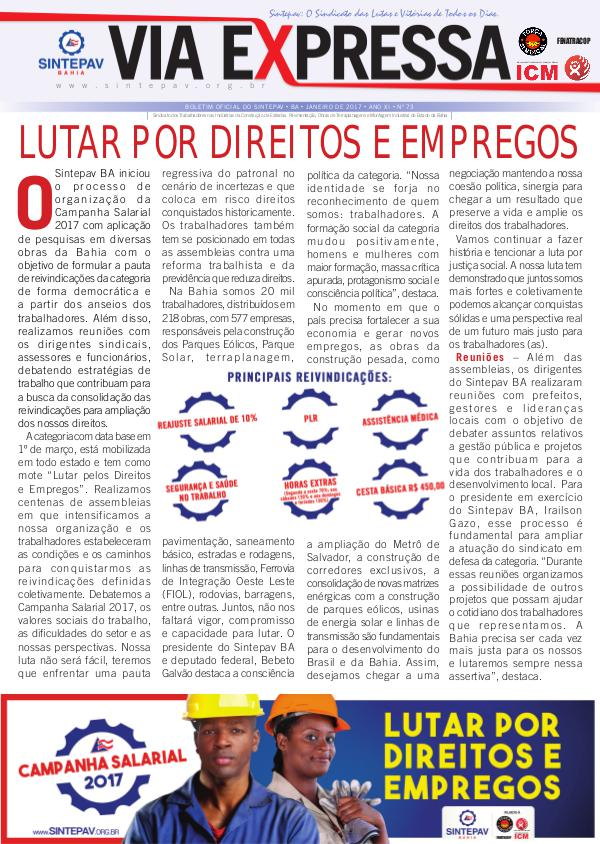 OSintepav BA iniciou o processo de organização da Campanha Salarial 2017 com aplicação de pesquisas em diversas obras da Bahia com o objetivo de formular a pauta de reivindicações da categoria de forma democrática e a partir dos anseios dos trabalhadores. Além disso, realizamos reuniões com os dirigentes sindicais, assessores e funcionários, debatendo estratégias de trabalho que contribuam para a busca da consolidação das reivindicações para ampliação dos nossos direitos. A categoria com data base em 1 º de março, está mobilizada em todo estado e tem como mote“ Lutar pelos Direitos e Empregos”. Realizamos centenas de assembleias em que intensificamos a nossa organização e os trabalhadores estabeleceram as condições e os caminhos para conquistarmos as reivindicações definidas coletivamente. Debatemos a Campanha Salarial 2017, os valores sociais do trabalho, as dificuldades do setor e as nossas perspectivas. Nossa luta não será fácil, teremos que enfrentar uma pauta