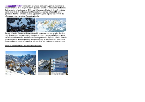 4) BAQUEIRA BERET: Grandvalira es una de las mejores, pero al hablar de la mejor, tenemos la de Baqueira Beret, que está en una de las mejores de Europa. Esta estacián esta situada en El Pirineo Catalan, en el Valle de Aran. A parte de ser la más visitada en España, tambien es la más grande; ofrece 155 km de pistas de distintos estilos y niveles, y pueden llegar a superar los 3000 m de altura sobre las montañas Maladeta y Aneto.