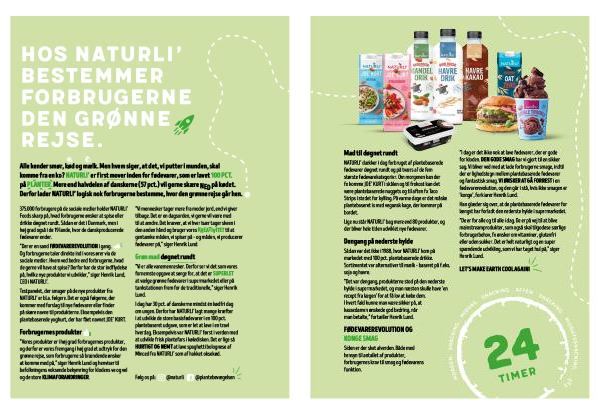 NATURLI ’ dækker i dag forbruget af plantebaserede fødevarer døgnet rundt og på tværs af de fem største fødevarekategorier . Om morgenen kan der fx komme JOE ’ KURT i skålen og til frokost kan det være plantebaserede nuggets og til aften fx Taco Strips i stedet for kylling . På varme dage er det måske plantebaseret is med vegansk kage , der kommer på bordet .
