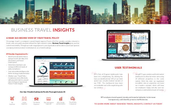 BUSINESS TRAVEL INSIGHTS A NEAR 360-DEGREE VIEW OF YOUR TRAVEL POLICY On average, travel is a company’s second largest expense. Due to all of the complex variables inherent in travel, costs can quickly escalate without the right controls in place. Business Travel Insights gives you that control and visibility. Through our multi-stage approach, your organization will be able to view travel spend at a company-wide level, down to individual air, car or hotel bookings. BTI Enables Organizations To: • Identify overall performance, analyze trends and deep-dive into historic and future travel spend • Determine maximum cost savings at different levels of policy compliance • Gain actionable intelligence for better strategy implementation • Monitor your Travel Policy Compliance more effectively with powerful metrics around Out-of-Program Spend and Future Travel insights Our User-Friendly Dashboards Provide Thorough Analysis Of: Air Expenses Hotel Expenses Car Rental Expenses Out-of-Program Expenses KPIs, Trends and Summaries Travel Policy Compliance