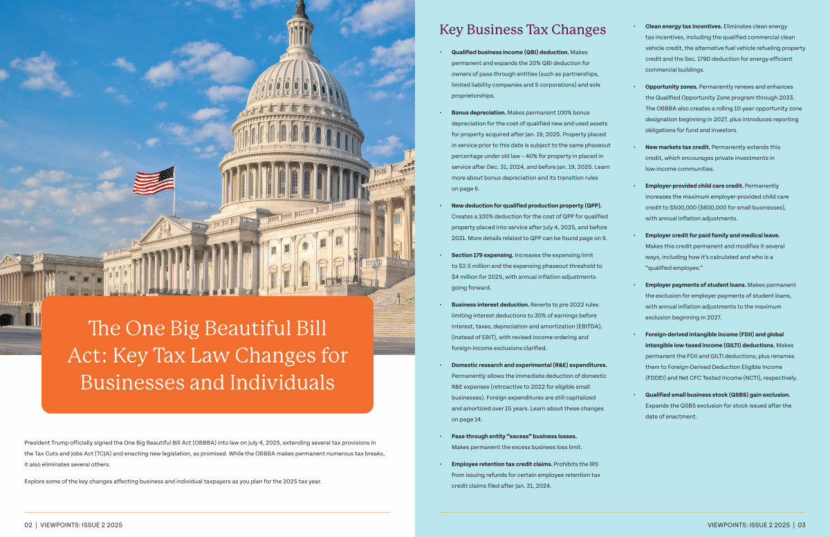 • Bonus depreciation. Makes permanent 100 % bonus depreciation for the cost of qualified new and used assets for property acquired after Jan. 19, 2025. Property placed in service prior to this date is subject to the same phaseout percentage under old law – 40 % for property in placed in service after Dec. 31, 2024, and before Jan. 19, 2025. Learn more about bonus depreciation and its transition rules on page 6.