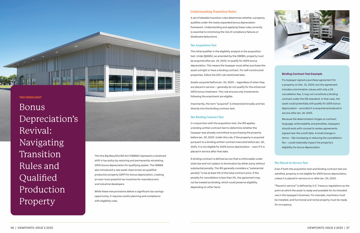 Because the determination hinges on contract language, enforceability and penalties, taxpayers should work with counsel to review agreements signed near the cutoff date. A small change in terms— like increasing or reducing the cancellation fee— could materially impact the property’ s eligibility for bonus depreciation.