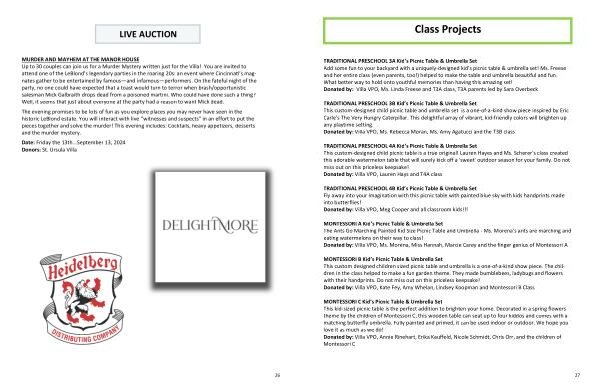 MONTESSORI B Kid ’ s Picnic Table & Umbrella Set This custom designed children sized picnic table and umbrella is a one-of-a-kind show piece . The children in the class helped to make a fun garden theme . They made bumblebees , ladybugs and flowers with their handprints . Do not miss out on this priceless keepsake ! Donated by : Villa VPO , Kate Fey , Amy Whelan , Lindsey Koopman and Montessori B Class