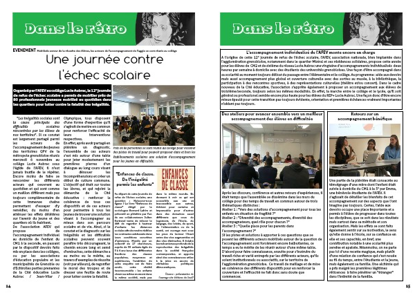 A l'origine de cette 12° journée de refus de l'échec scolaire, l'AFEV, association nationale, bien implantée dans l'agglomération grenobloise, notamment dans le quartier Mistral et ses résidences solidaires, propose cette année pour les élèves de CM2 et de sixième du réseau Lucie Aubrac une vingtaine d'accompagnements individualisés deux heures par semaine à domicile avec des étudiants des universités grenobloises. Une façon d'être accompagné dans sa scolarité au moment toujours délicat du passage entre l'élémentaire et le collège. Au programme : aide aux devoirs mais aussi accompagnement plus global et ouverture culturelle avec des sorties au musée, à la bibliothèque, la participation à des rencontres sportives, à des représentations culturelles (théâtre et/ou concert). Dans le cadre nouveau de la Cité éducative, l'association s'apprête également à proposer un accompagnement aux élèves de troisième/seconde, toujours selon les mêmes modalités. En effet, la marche entre le collège et le lycée, qu'il soit général ou professionel semble encore plus haute pour les élèves du REP+ Lucie Aubrac. Une façon donc d'être encore mieux épaulé pour cette transition pas toujours évidente, orientation et premières échéances vraiment importantes n'aidant pas toujours.