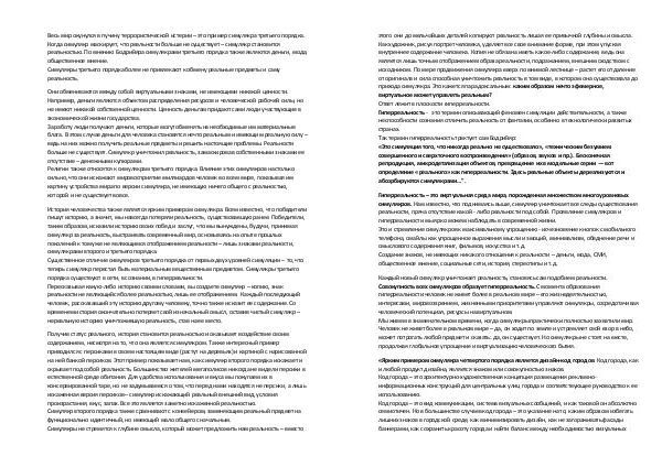 Получив статус реального, история становится реальностью и оказывает воздействие своим содержанием, несмотря на то, что она является симулякром. Также интересный пример приводился с персиками в своем настоящем виде( растут на деревьях) и картиной с нарисованной на ней банкой персиков. Этот пример показывает нам, как симулякр второго порядка искажает и скрывает под собой реальность. Большинство жителей мегаполисов никогда не видели персики в естественной среде обитания. Для удобства использования и вкуса мы покупаем их в консервированной таре, но не задумываемся о том, что перед нами находятся не персики, а лишь искаженная версия персиков – симулякр искажающий реальный внешний вид, условия произрастания, вкус, запах. Все это является заметно искаженной реальностью. Симулякр второго порядка также сравнивают с конвейером, заменяющим реальный предмет на функционально идентичный, но имеющий мало общего с начальным. Симулякры не стремятся к глубине смысла, который может предложить нам реальность – вместо