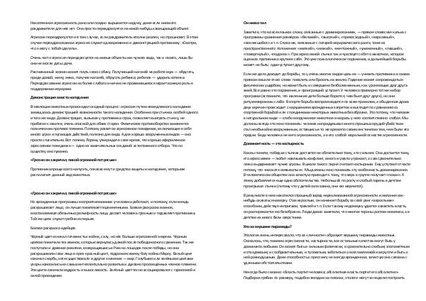Если же дело доходит до борьбы, то у очень многих видов цель ее— унизить противника в самом прямом смысле этого слова: повалить или бросить на землю. Падение может сопровождаться физическим ущербом, но может быть и совершено безболезненным, как у роняющих друг друга змей. Все равно это поражение, и проигравший уступает. У человека примерно тот же набор программ( вспомните, что маленькие дети больше борются, чем бьют друг друга), но они ритуализированы слабо. В спорте борьба воспроизводится по всем правилам, а обыденная драка двух мужчин происходит с нарушением врожденных запретов и выглядит по сравнению со спортивной борьбой или с поединками некоторых животных безобразно. Это потому, что человек в натуральном виде— слабо вооруженное животное и мораль у него соответственно слабая. Мы должны всегда это ясно понимать: человек напридумывал много страшных орудий убийства и стал необычайно вооруженным, оставшись в то же время по своим инстинктам тем, чем были его предки. Беда человека не в его агрессивности, а в его слабой моральной оснастке агрессивности.