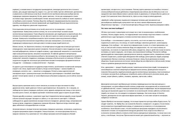 воришек), а независимые от государства производители, имеющие достаточно чего-то своего( землю, дом, орудия производства, акции и т. п.), для того чтобы чувство собственного достоинства и уверенность в собственных силах были точкой отсчета при бессознательном выборе мозгом подходящих программ поведения. Кстати, давно замечено, что как раз находящиеся в таком состоянии люди проявляют в наибольшей степени желание помогать слабым из своего кармана и не требовать ничего взамен. Поэтому общество свободного предпринимательства оказалось способным реализовать во вполне приемлемой для людей форме больше социалистических идеалов, чем общество « реального социализма ».