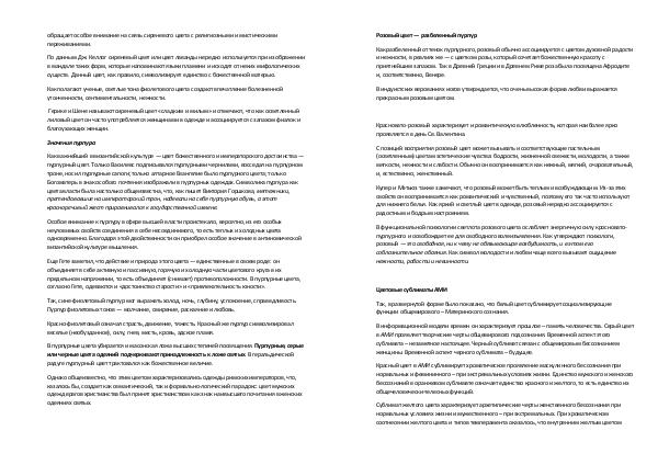 Еще Гете заметил, что действие и природа этого цвета— единственные в своем роде: он объединяет в себе активную и пассивную, горячую и холодную части цветового круга в их предельном напряжении, то есть объединяет( снимает) противоположности. В пурпурные цвета, согласно Гете, одеваются и « достоинство старости » и « привлекательность юности ».