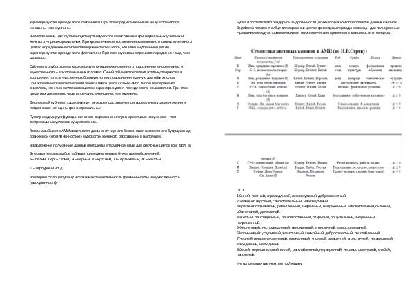 ЦТО 1. Синий: честный, справедливей, невозмутимый, добросовестный. 2. Зеленый: черствый, самостоятельный, невозмутимый. 3. Красный: отзывчивый, решительный, энергичный, напряженный, чувствительный, сильный, обаятельный, деятельный. 4. Желтый: разговорчивый, безответственный, открытый, общительный, энергичный, напряженный. 5. Фиолетовый: несправедливый, неискренний, эгоистичный, самостоятельный. 6. Коричневый: уступчивый, завистливый, спокойный, добросовестный, расслабленный. 7. Черный: непривлекательный, молчаливый, упрямый, замкнутый, эгоистичный, независимый, враждебный, нелюдимый. 8. Серый: нерешительный, вялый, расслабленный, неуверенный, несамостоятельный, слабый, пассивный.