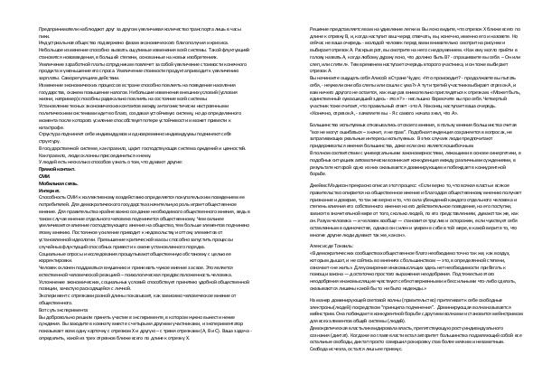 Предприниматели наблюдают друг за другом увеличивая количество транспорта лишь в часы пики. Индустриальное общество подвержено фазам экономического благополучия и кризиса. Небольшое изменение способно вызвать ощутимые изменения всей системы. Такой флуктуацией становятся нововведения, в большей степени, основанные на новых изобретениях. Увеличение заработной платы сотрудникам повлечет за собой увеличение стоимости конечного продукта и уменьшение его спроса. Увеличение стоимости продукта приводит к увеличению зарплаты. Саморегуляция в действии. Изменение экономических процессов в стране способно повлиять на поведение населения государства, скажем повышение налогов. Небольшие изменения внешних условий( условия жизни, например) способны радикально повлиять на состояние всей системы. Установление тесных экономических контактов между антагонистически настроенными политическими системами идет во благо, создавая устойчивую систему, но до определенного момента после которого усиление способствует потере устойчивости и может привести к катастрофе. Структура подчиняет себе индивидуумов и одновременно индивидуумы подчиняют себе структуру. В государственной системе, как правило, царит господствующая система суждений и ценностей. Как правило, люди склонны присоединиться к нему. У людей есть несколько способов узнать о том, что думают другие: Прямой контакт. СМИ. Мобильная связь. Интернет. Способность СМИ к коллективному воздействию определяется покупательским поведением ее потребителей. Для демократического государства значительную роль играет общественное мнение. Для правительства крайне важно создание необходимого общественного мнения, ведь в таком случае мнение отдельного человека подчиняется общественному. Чем сильнее увеличивается влияние господствующего мнения на общество, тем больше элементов подчинено этому мнению. Постоянное усиление приводит к недовольству и оттоку элементов от установленной идеологии. Превышение критической массы способно запустить процессы случайных флуктуаций способных привести к смене установленного порядка. Социальные опросы и исследования прощупывают общественную обстановку с целью ее корректировки. Человек склонен поддаваться внушению и принимать чужое мнение за свое. Это является естественной человеческой реакцией – психологическая предрасположенность человека. Усложнение экономических, социальных условий способствует принятию удобной общественной позиции, зачастую расходящейся с личной. Эксперимент с отрезками разной длины показывает, как зависимо человеческое мнение от общественного. Вот суть эксперимента: Вы добровольно решили принять участие в эксперименте, в котором нужно вынести некие суждения. Вы заходите в комнату вместе с четырьмя другими участниками, и экспериментатор показывает всем одну карточку с отрезком X и другую – с тремя отрезками( А, В и С). Ваша задача- определить, какой из трех отрезков ближе всего по длине к отрезку X.