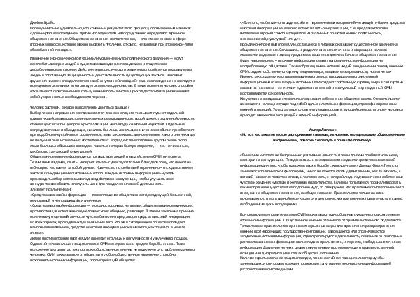 Человек растерян, в каком направлении двигаться дальше? Выбор такого направления всегда зависит от тех немногих, кто указывает путь: от отдельной группы людей, авангардистов или активных революционеров, порой даже от отдельной личности, становящейся как бы центром кристаллизации. Амплитуда колебаний нарастает. Отдельные непредсказуемые и обладающие, казалось бы, лишь локальным значением события приобретают при подобном неустойчивом состоянии системы такое колоссальное влияние, какого они никогда не получили бы в нормальных обстоятельствах. Когда действия подобной группы очень скоро стали бы лишь небольшим эпизодом, память о котором быстро стирается,— т. е. не чем иным, как быстро затухающей флуктуацией. Общественное мнение формируется посредством людей и воздействием СМИ, интернета. Те или иные издания, газеты, интернет каналы существуют только благодаря тому, что имеют на себя спрос, что влечет за собой деньги. Количество потребителей ограничено – отсюда возникает жесткая конкуренция и естественный отбор. Каждый источник информации вынужден производить отбор материалов под воздействием конкуренции, чтобы улучшить свое конкурентоспособность и получить шанс для продолжения своей деятельности. Элизабет Ноэль-Нейман: « Средства массовой информации— это воплощение общественности, вездесущей, безымянной, неуловимой и не поддающейся влиянию ». « Средства массовой информации— это односторонняя, непрямая, общественная коммуникация, противостоящая естественному человеческому общению, разговору. В этом и заключена причина появления у отдельной личности чувства бессилия перед лицом средств массовой информации; во всех опросах, проводимых для выяснения того, кто же в сегодняшнем обществе обладает наибольшим влиянием, средства массовой информации оказываются, как правило, в начале списка ». Любое противостояние против СМИ приведет его лишь к популярности и увеличению продаж. Одинокий человек лишен защиты против СМИ монстров, как и средств борьбы с ними. Такое положение дел царит до тех пор, пока общественное мнение не подключится к проблеме данного человека. СМИ также зависят от общества и любое общественное изменение способно похоронить источник информации, противоречащий обществу.