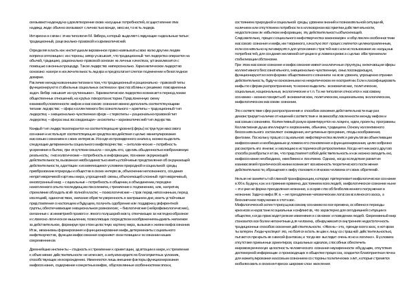 Определяя власть как институциализированное право навязывать свою волю другим людям вопреки оппозиции с их стороны, автор указывает, что традиционный тип лидерства опирается на обычай, традицию, рационально-правовой основан на личных качествах, устанавливается с помощью законных процедур. Такое лидерство имперсонально. Харизматическое лидерство основано на вере в исключительность лидера и предполагает слепое подчинение и безоглядное доверие. Различие между названными типами в том, что традиционный и рационально- правовой типы функционируют в стабильных социальных системах и приспособлены к решению повседневных задач. Вебер называет их « рутинными ». Харизматическое лидерство возникает в период ломки общественных отношений, на крутых поворотах истории. Предложенную схему взаимообусловленности мифов и массового сознания можно дополнить соответствующими типами лидерства: – сфера коллективного бессознательного – архетипы – традиционный тип лидерства; – эмоционально-чувственная сфера – стереотипы – рационально-правовой тип лидерства; – сфера смыслосозидающая – аксиотипы – харизматический тип лидерства.