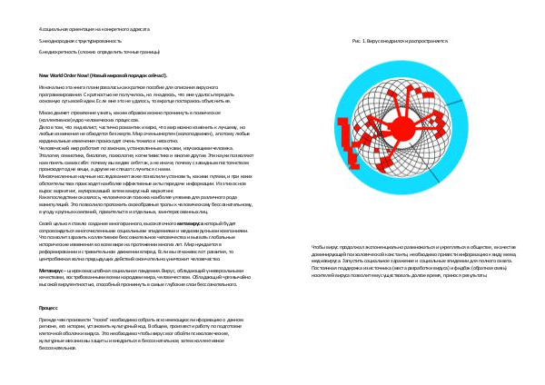 Своей целью я ставлю создание многогранного, высокоточного метавируса который будет сопровождаться многочисленными социальными эпидемиями и медиавирусными компаниями. Что позволит заразить коллективное бессознательное человечества и вызвать глобальные исторические изменения во всем мире на протяжении многих лет. Мир нуждается в реформировании и стремительном движении вперед. Если мы откажемся от развития, то центробежная волна предыдущих действий окончательно уничтожит человечество.