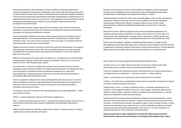Наш вид, пояснил Докинз, уникален в своей способности передавать знания посредством культуры: языка, традиций, искусства, архитектуры, науки. Люди изобрели новую форму воспроизводства, новую форму потенциального бессмертия— « мемы »: