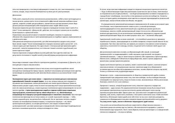 В случае, когда культовая информация находится в ведении специального жреческого института— будь то обеспечивающие подготовку преемников служители или просто семьи, ответственные за отправление культа отдельных богов,— она будет распространяться активнее и передаваться в гораздо более точной форме, чем если бы в этом принимало участие все сообщество. Элементы культа, которым удалось мотивировать своих адептов на создание тиражирующей их религиозной организации, окажутся более жизнеспособными, чем другие.