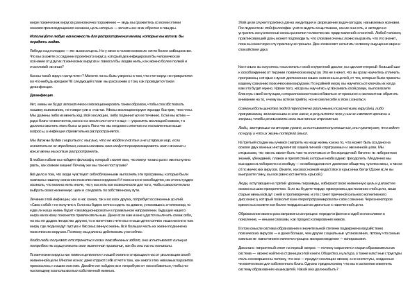 Как только вы научитесь « выключать » свой внутренний диалог, вы сделаете первый большой шаг к освобождению от тирании психических вирусов. Это не значит, что вы сразу научитесь отличать программы, которые служат достижению ваших жизненных целей, от тех, которые были привиты вашему сознанию психическими вирусами. По крайней мере, вы научитесь отключать их когда вам это будет нужно. Кроме того, когда вы научитесь успокаивать свой разум, вы позволите блеснуть своей интуиции, которая поможет вам избавиться от привычек и заставит вас обратить внимание на то, к чему вы хотели прийти, но не смели себе в этом сознаться.