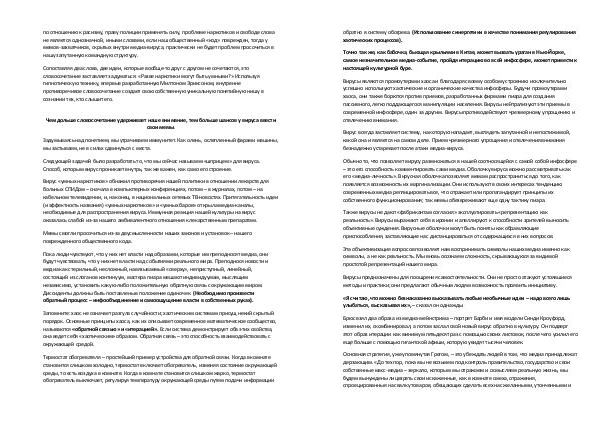 по отношению к расизму, праву полиции применять силу, проблеме наркотиков и свободе слова не является однозначной, иными словами, если наш общественный « код » поврежден, тогда у мемов-захватчиков, скрытых внутри медиа-вируса, практически не будет проблем просочиться в нашу запутанную командную структуру.