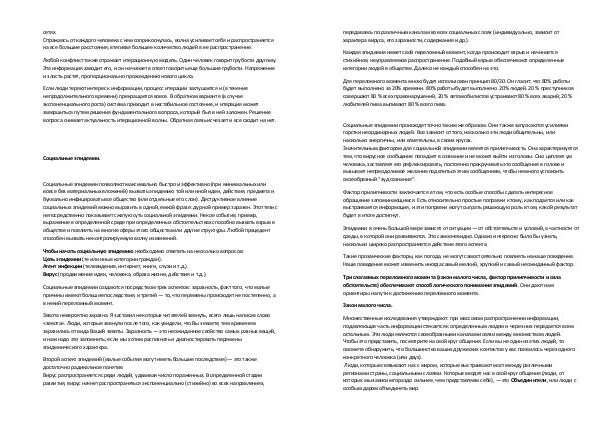 Социальные эпидемии происходят точно таким же образом. Они также запускаются усилиями горстки неординарных людей. Все зависит от того, насколько эти люди общительны, или насколько энергичны, или влиятельны, в своих кругах. Значительным фактором для социальной эпидемии является прилипчивость. Она характеризуется тем, что вирусное сообщение попадает в сознание и не может выйти из головы. Оно цепляет ум человека, заставляет его рефлексировать, постоянно прокручивать это сообщение в голове и вызывает непреодолимое желание поделиться этим сообщением, чтобы немного успокоить своеобразный“ зуд сознания”.