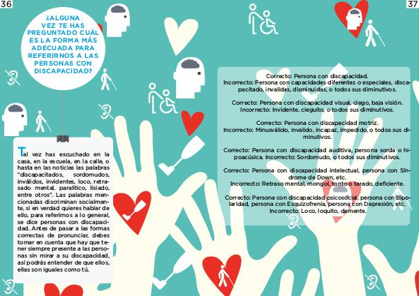 36 ¿ALGUNA VEZ TE HAS PREGUNTADO CUÁL ES LA FORMA MÁS ADECUADA PARA REFERIRNOS A LAS PERSONAS CON DISCAPACIDAD? T al vez has escuchado en la casa, en la escuela, en la calle, o hasta en las noticias las palabras “discapacitados, sordomudos, inválidos, invidentes, loco, retra- sado mental, paralitico, lisiado, entre otros”. Las palabras men- cionadas discriminan socialmen- te, si en verdad quieres hablar de ello, para referirnos a lo general, se dice personas con discapaci- dad. Antes de pasar a las formas correctas de pronunciar, debes tomar en cuenta que hay que te- ner siempre presente a las perso- nas sin mirar a su discapacidad, así podrás entender de que ellos, ellas son iguales como tú.