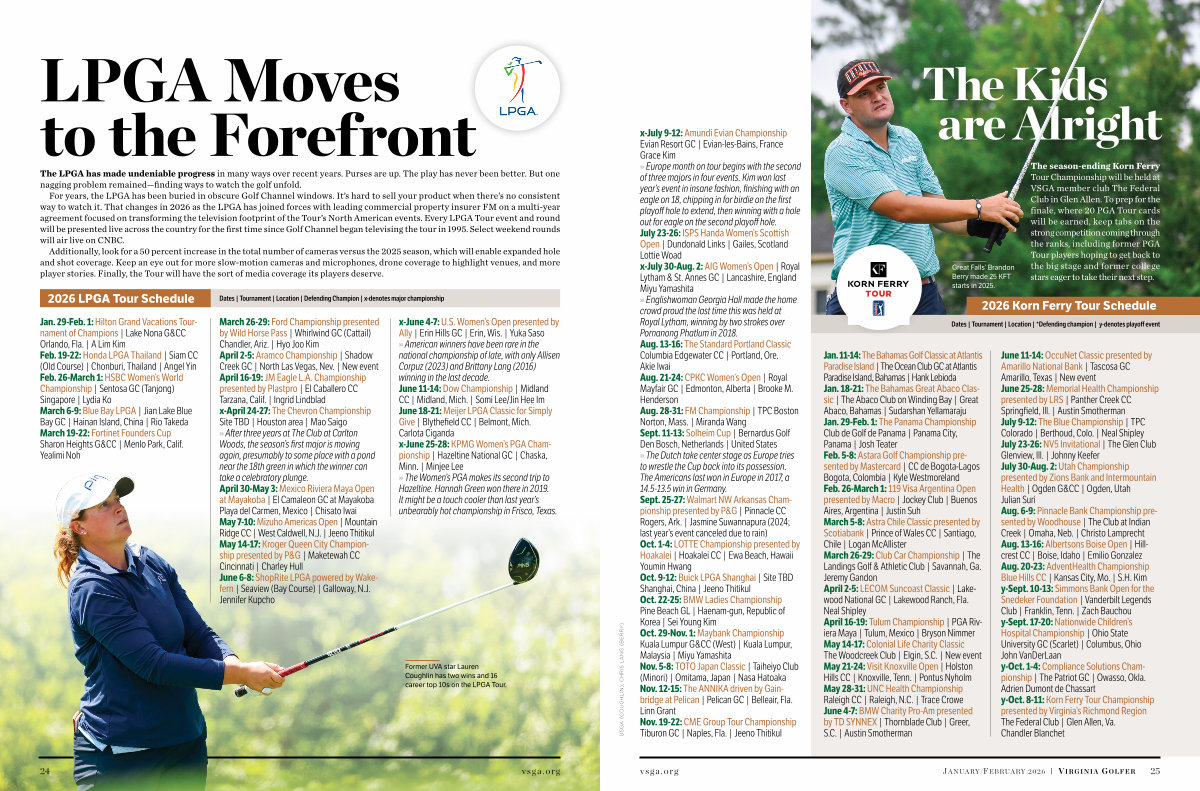 March 26-29: Ford Championship presented by Wild Horse Pass | Whirlwind GC( Cattail) Chandler, Ariz. | Hyo Joo Kim April 2-5: Aramco Championship | Shadow Creek GC | North Las Vegas, Nev. | New event April 16-19: JM Eagle L. A. Championship presented by Plastpro | El Caballero CC Tarzana, Calif. | Ingrid Lindblad x-April 24-27: The Chevron Championship Site TBD | Houston area | Mao Saigo » After three years at The Club at Carlton Woods, the season’ s first major is moving again, presumably to some place with a pond near the 18th green in which the winner can take a celebratory plunge. April 30-May 3: Mexico Riviera Maya Open at Mayakoba | El Camaleon GC at Mayakoba Playa del Carmen, Mexico | Chisato Iwai May 7-10: Mizuho Americas Open | Mountain Ridge CC | West Caldwell, N. J. | Jeeno Thitikul May 14-17: Kroger Queen City Championship presented by P & G | Maketewah CC Cincinnati | Charley Hull June 6-8: ShopRite LPGA powered by Wakefern | Seaview( Bay Course) | Galloway, N. J. Jennifer Kupcho x-June 4-7: U. S. Women’ s Open presented by Ally | Erin Hills GC | Erin, Wis. | Yuka Saso » American winners have been rare in the national championship of late, with only Allisen Corpuz( 2023) and Brittany Lang( 2016) winning in the last decade. June 11-14: Dow Championship | Midland CC | Midland, Mich. | Somi Lee / Jin Hee Im June 18-21: Meijer LPGA Classic for Simply Give | Blythefield CC | Belmont, Mich. Carlota Ciganda x-June 25-28: KPMG Women’ s PGA Championship | Hazeltine National GC | Chaska, Minn. | Minjee Lee » The Women’ s PGA makes its second trip to Hazeltine. Hannah Green won there in 2019. It might be a touch cooler than last year’ s unbearably hot championship in Frisco, Texas.
