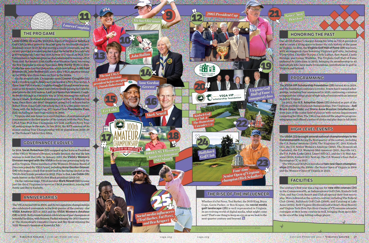 The VSGA turned 100 in 2004, and its two signature championships also celebrated centennials in the first quarter of the century— the VSGA Amateur( 17) in 2013 and the VSGA Women’ s Amateur( 18) in 2025. Both events featured celebrations of past champions at beautiful facilities, with Brinson Paolini winning the 2013 Amateur at The Homestead’ s Cascades Course and Sky Sload winning the 2025 Women’ s Amateur at Keswick Club.