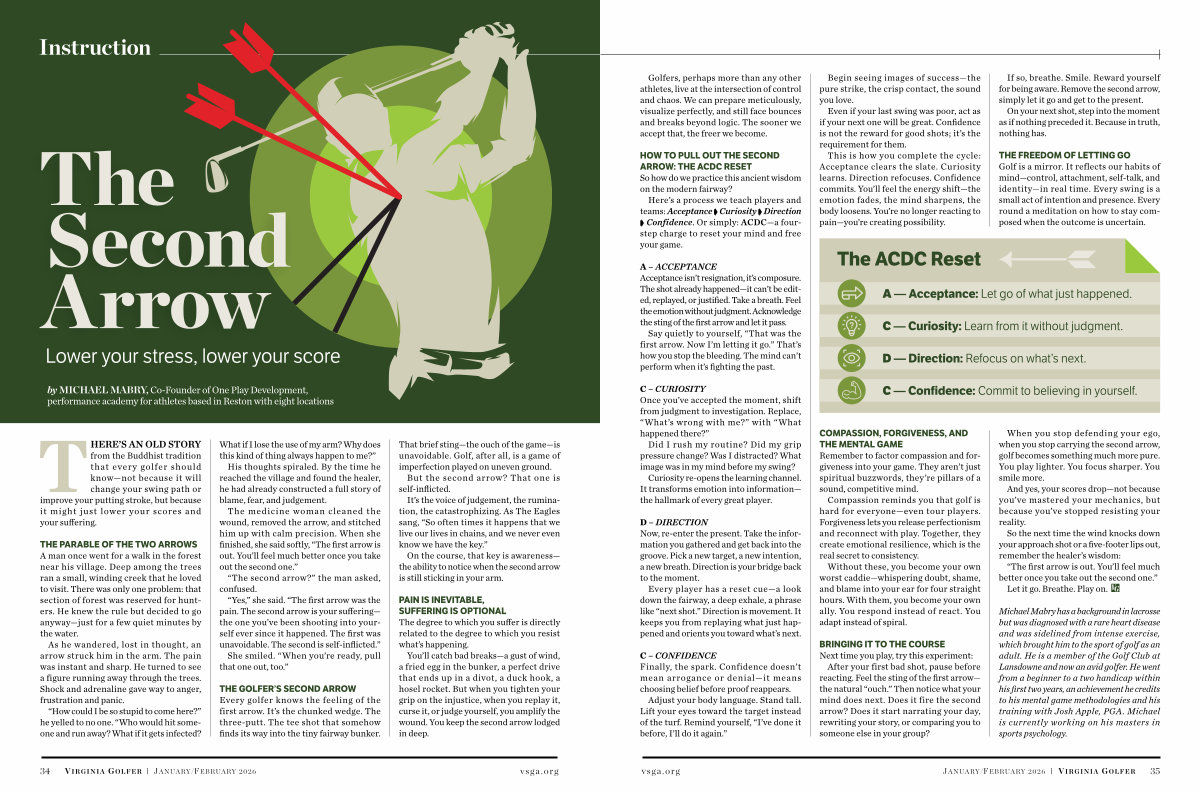 Michael Mabry has a background in lacrosse but was diagnosed with a rare heart disease and was sidelined from intense exercise, which brought him to the sport of golf as an adult. He is a member of the Golf Club at Lansdowne and now an avid golfer. He went from a beginner to a two handicap within his first two years, an achievement he credits to his mental game methodologies and his training with Josh Apple, PGA. Michael is currently working on his masters in sports psychology. vsga. org J ANUARY / F EBRUARY 2026 | V IRGINIA G OLFER
