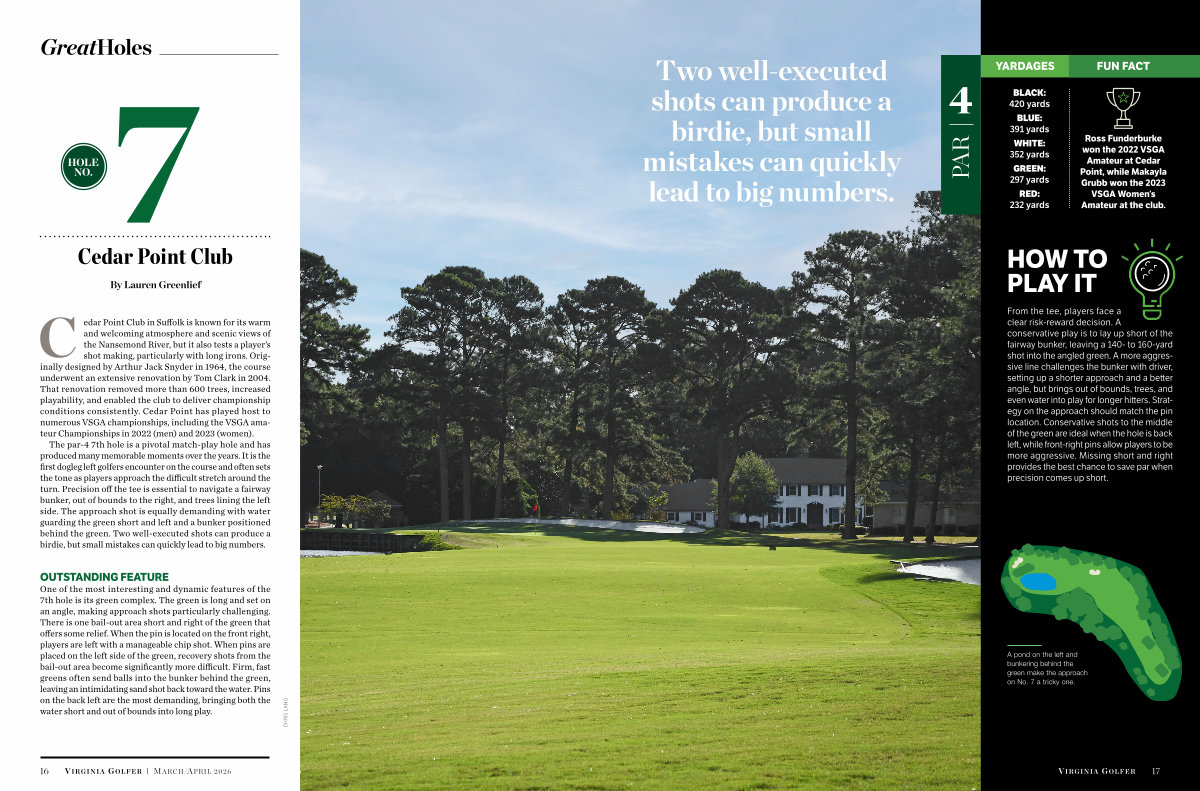 C edar Point Club in Suffolk is known for its warm and welcoming atmosphere and scenic views of the Nansemond River, but it also tests a player’ s shot making, particularly with long irons. Originally designed by Arthur Jack Snyder in 1964, the course underwent an extensive renovation by Tom Clark in 2004. That renovation removed more than 600 trees, increased playability, and enabled the club to deliver championship conditions consistently. Cedar Point has played host to numerous VSGA championships, including the VSGA amateur Championships in 2022( men) and 2023( women).