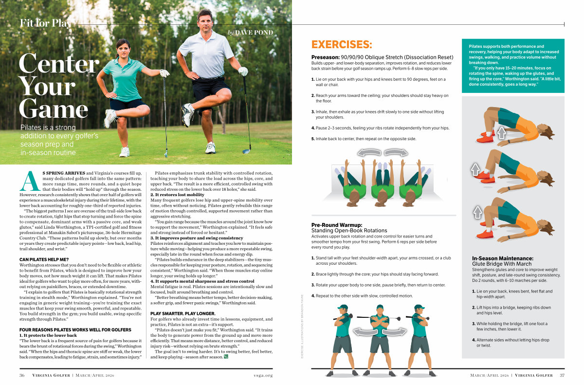 “ You gain range because the muscles around the joint know how to support the movement,” Worthington explained.“ It feels safe and strong instead of forced or hesitant.” 3. It improves posture and swing consistency Pilates reinforces alignment and teaches you how to maintain posture while moving— helping you produce a more repeatable swing, especially late in the round when focus and energy dip.