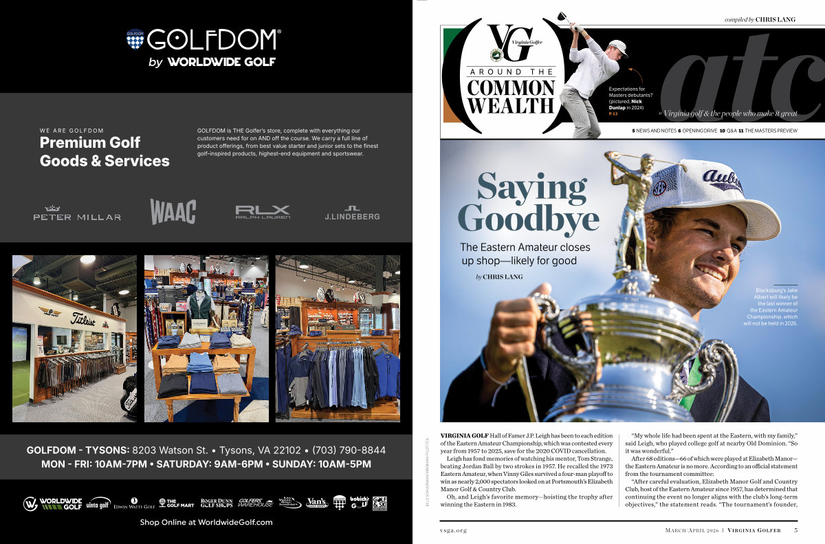VIRGINIA GOLF Hall of Famer J. P. Leigh has been to each edition of the Eastern Amateur Championship, which was contested every year from 1957 to 2025, save for the 2020 COVID cancellation.