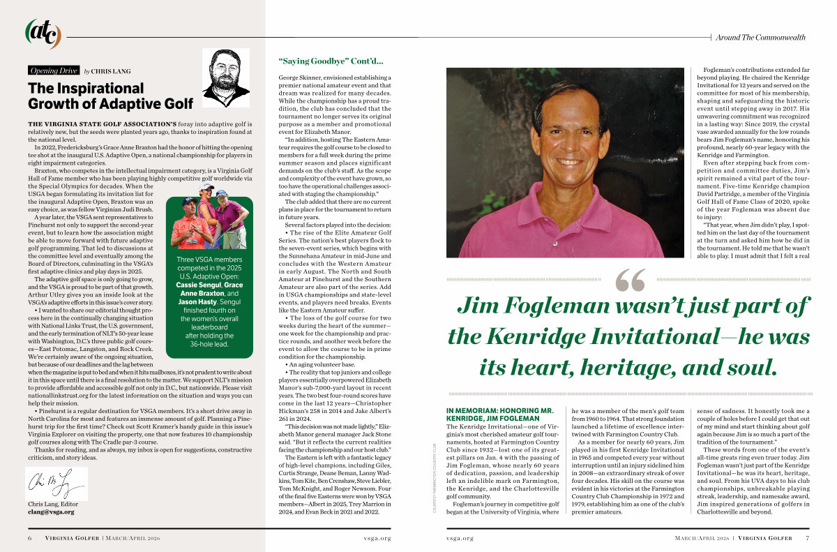 The adaptive golf space is only going to grow, and the VSGA is proud to be part of that growth. Arthur Utley gives you an inside look at the VSGA’ s adaptive efforts in this issue’ s cover story.