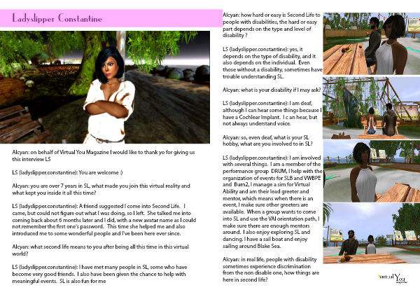 LS (ladyslipper.constantine): I am involved with several things. I am a member of the performance group DRUM, I help with the organization of events for SLB and VWBPE and Burn2, I manage a sim for Virtual Ability and am their lead greeter and mentor, which means when there is an event, I make sure other greeters are available. When a group wants to come into SL and use the VAI orientation path, I make sure there are enough mentors around. I also enjoy exploring SL and dancing. I have a sail boat and enjoy sailing around Blake Sea.