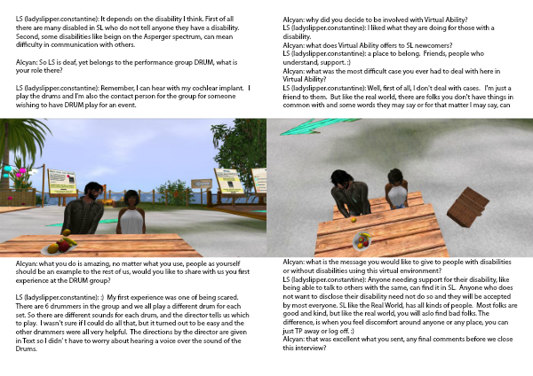 LS (ladyslipper.constantine): It depends on the disability I think. First of all there are many disabled in SL who do not tell anyone they have a disability. Second, some disabilities like beign on the Asperger spectrum, can mean difficulty in communication with others.