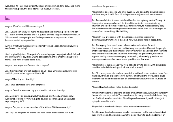 Jim: I originally joined SL as part of a research project. A project which helped me immensely. Today it is a way to connect with other amputee's and to do things I still have trouble doing in RL.