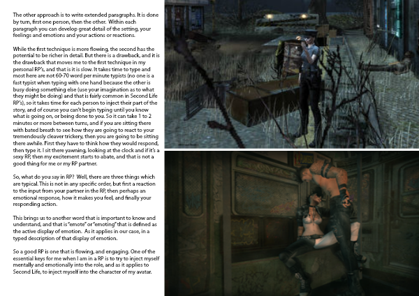 So a good RP is one that is flowing, and engaging. One of the essential keys for me when I am in a RP is to try to inject myself mentally and emotionally into the role, and as it applies to Second Life, to inject myself into the character of my avatar.