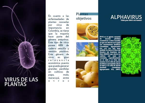 (PVY) es el agente causante de muchas pérdidas económicas a nivel mundial, ya que sus efectos en la papá son devastadores (Instituto Colombiano Agropecuario ICA, s.f.). Por otro lado, también se tiene el Virus del Mosaico del Enanismo del Maíz (MDMV), que afecta los cultivos del maíz en Colombia, específicamente en el valle y el virus del mosaico de la caña de azúcar (SCMV) el cual también afecta al maíz y a la caña de azúcar (Instituto Colombiano Agropecuario ICA, 2007).