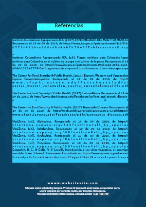 The Center for Food Security & Public Health. (2017). Eastern, Western and Venezuelan Equine Encephalomyelitis. Recuperado el 19 de 09 de 2019, de http://www.cfsph.iastate.edu/Factsheets/pdfs/easter_wester_venezuelan_equine_encephalomyelitis.pdf