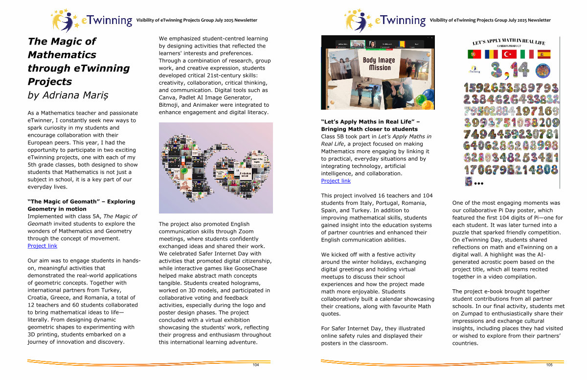 One of the most engaging moments was our collaborative Pi Day poster, which featured the first 104 digits of Pi— one for each student. It was later turned into a puzzle that sparked friendly competition. On eTwinning Day, students shared reflections on math and eTwinning on a digital wall. A highlight was the AIgenerated acrostic poem based on the project title, which all teams recited together in a video compilation.