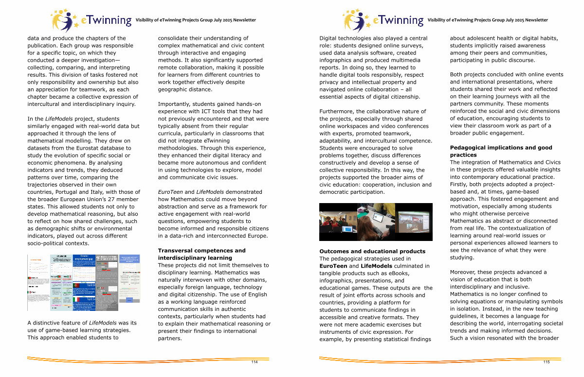 Outcomes and educational products The pedagogical strategies used in EuroTeen and LifeModels culminated in tangible products such as eBooks, infographics, presentations, and educational games. These outputs are the result of joint efforts across schools and countries, providing a platform for students to communicate findings in accessible and creative formats. They were not mere academic exercises but instruments of civic expression. For example, by presenting statistical findings
