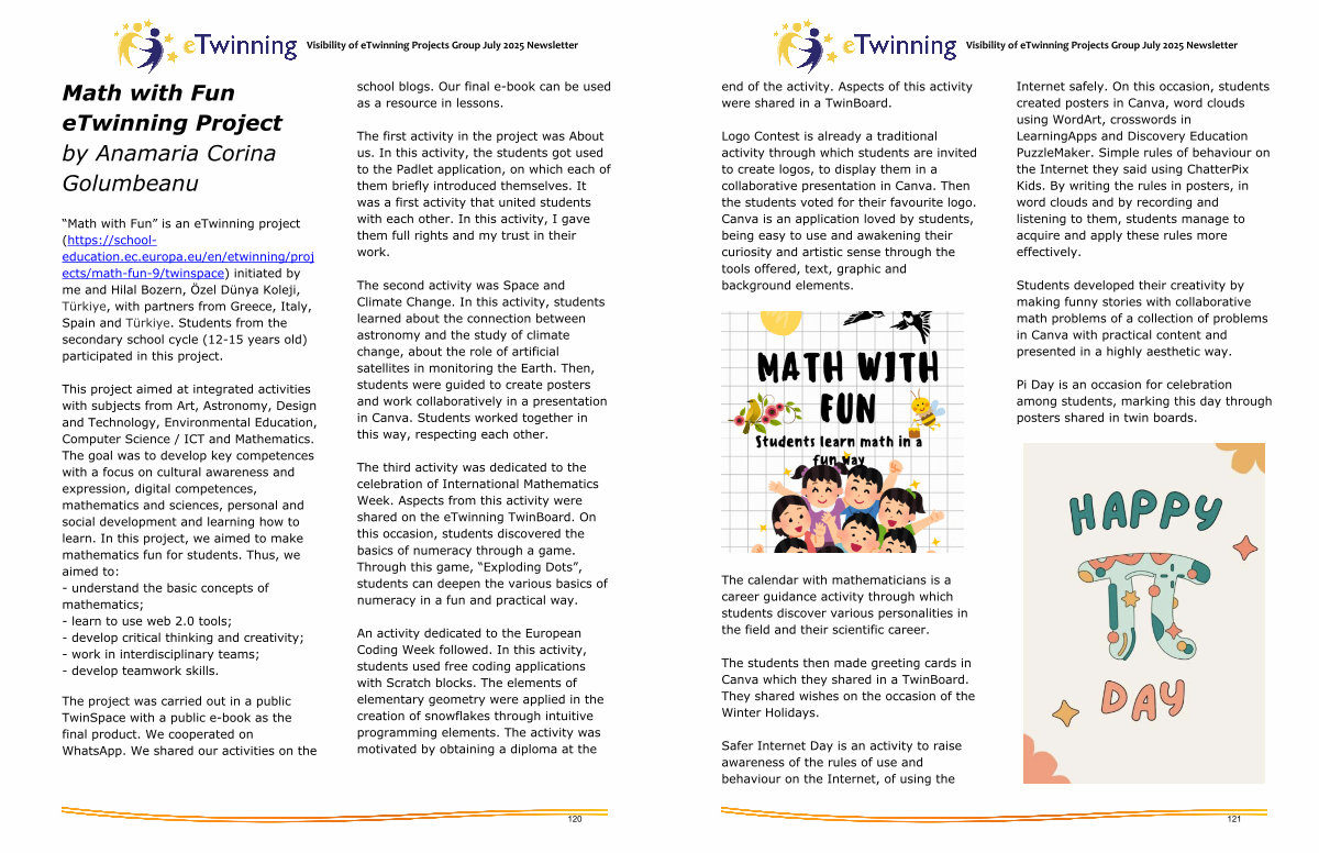 “ Math with Fun” is an eTwinning project( https:// schooleducation. ec. europa. eu / en / etwinning / proj ects / math-fun-9 / twinspace) initiated by me and Hilal Bozern, Özel Dünya Koleji, Türkiye, with partners from Greece, Italy, Spain and Türkiye. Students from the secondary school cycle( 12-15 years old) participated in this project.