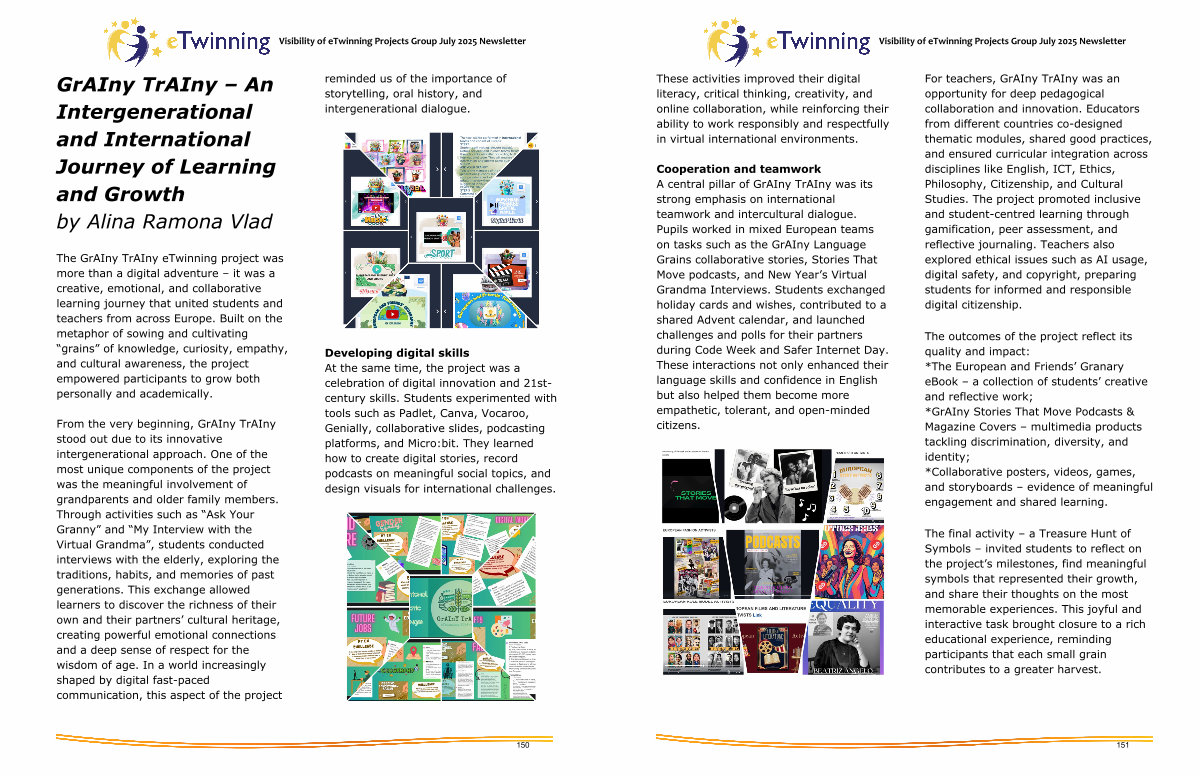 The outcomes of the project reflect its quality and impact: * The European and Friends’ Granary eBook – a collection of students’ creative and reflective work; * GrAIny Stories That Move Podcasts & Magazine Covers – multimedia products tackling discrimination, diversity, and identity; * Collaborative posters, videos, games, and storyboards – evidence of meaningful engagement and shared learning.