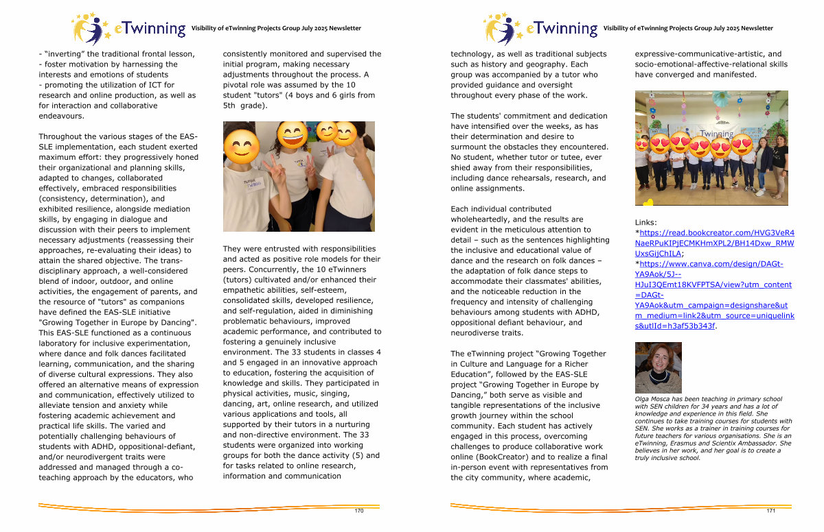 Throughout the various stages of the EAS- SLE implementation, each student exerted maximum effort: they progressively honed their organizational and planning skills, adapted to changes, collaborated effectively, embraced responsibilities( consistency, determination), and exhibited resilience, alongside mediation skills, by engaging in dialogue and discussion with their peers to implement necessary adjustments( reassessing their approaches, re-evaluating their ideas) to attain the shared objective. The transdisciplinary approach, a well-considered blend of indoor, outdoor, and online activities, the engagement of parents, and the resource of " tutors " as companions have defined the EAS-SLE initiative " Growing Together in Europe by Dancing ". This EAS-SLE functioned as a continuous laboratory for inclusive experimentation, where dance and folk dances facilitated learning, communication, and the sharing of diverse cultural expressions. They also offered an alternative means of expression and communication, effectively utilized to alleviate tension and anxiety while fostering academic achievement and practical life skills. The varied and potentially challenging behaviours of students with ADHD, oppositional-defiant, and / or neurodivergent traits were addressed and managed through a coteaching approach by the educators, who
