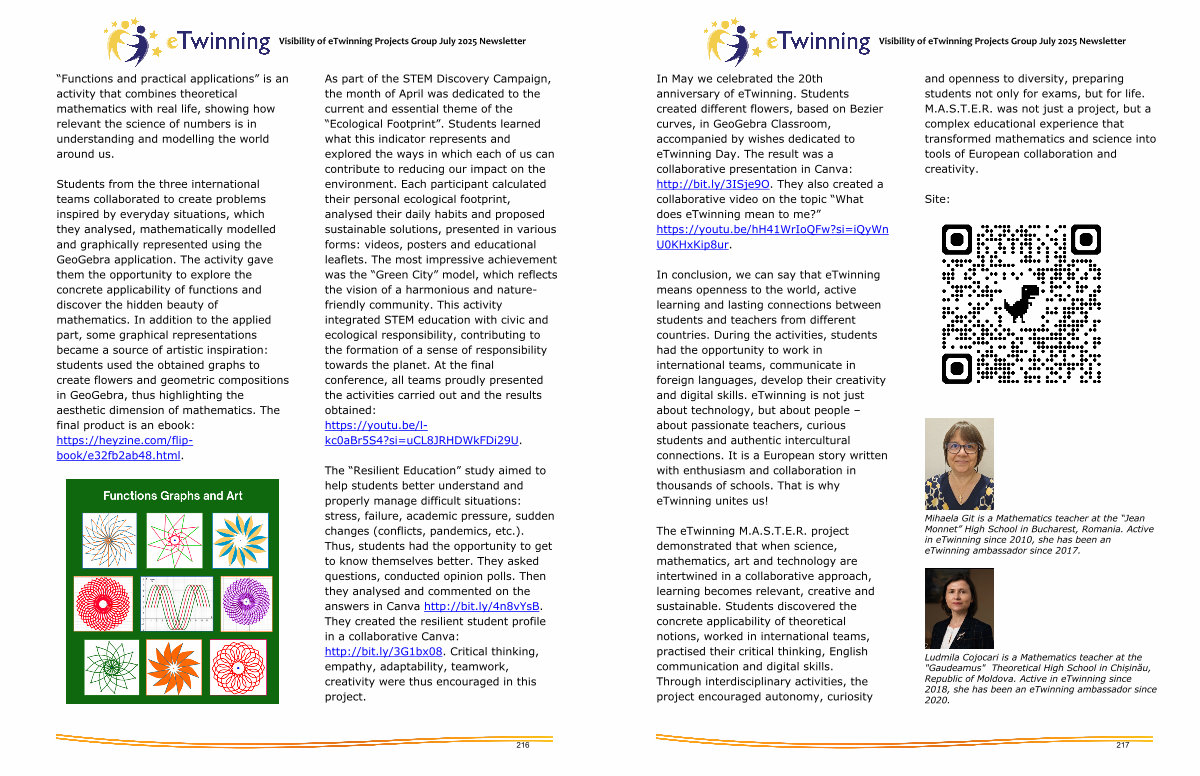In May we celebrated the 20th anniversary of eTwinning. Students created different flowers, based on Bezier curves, in GeoGebra Classroom, accompanied by wishes dedicated to eTwinning Day. The result was a collaborative presentation in Canva: http:// bit. ly / 3ISje9O. They also created a collaborative video on the topic“ What does eTwinning mean to me?” https:// youtu. be / hH41WrIoQFw? si = iQyWn U0KHxKip8ur.