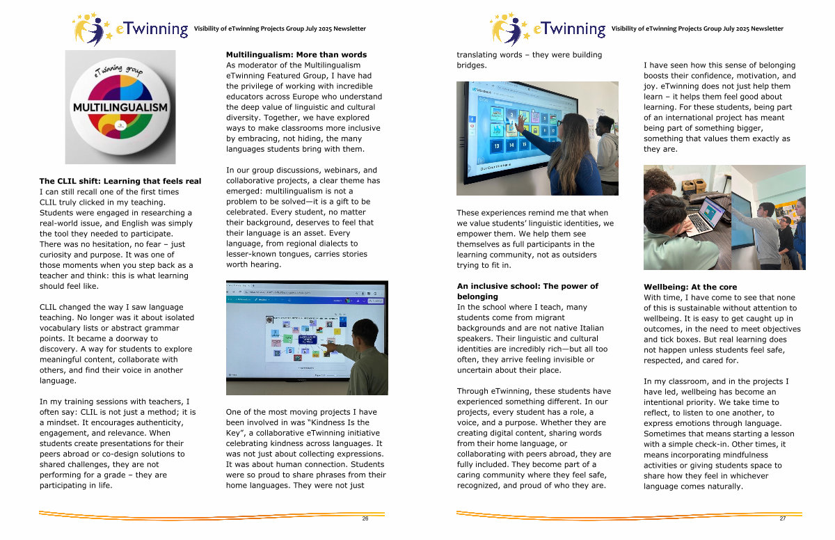 Multilingualism: More than words As moderator of the Multilingualism eTwinning Featured Group, I have had the privilege of working with incredible educators across Europe who understand the deep value of linguistic and cultural diversity. Together, we have explored ways to make classrooms more inclusive by embracing, not hiding, the many languages students bring with them.