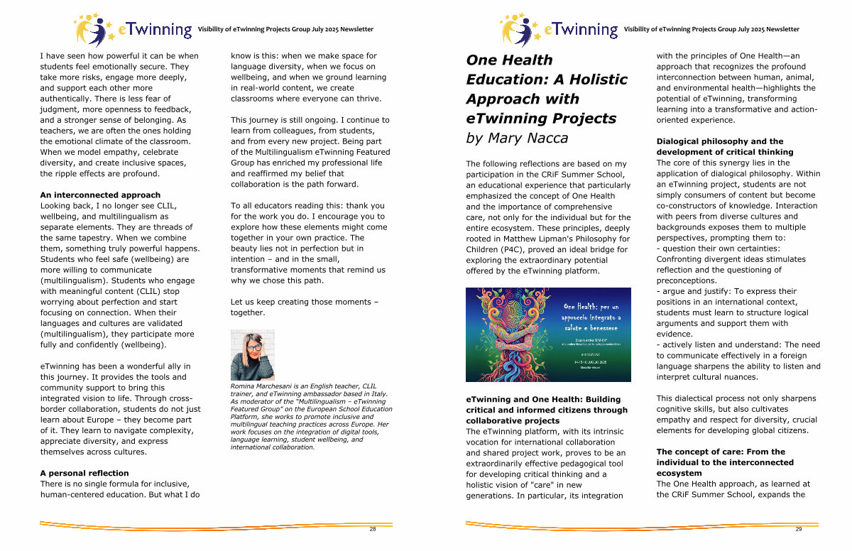 The following reflections are based on my participation in the CRiF Summer School, an educational experience that particularly emphasized the concept of One Health and the importance of comprehensive care, not only for the individual but for the entire ecosystem. These principles, deeply rooted in Matthew Lipman ' s Philosophy for Children( P4C), proved an ideal bridge for exploring the extraordinary potential offered by the eTwinning platform.