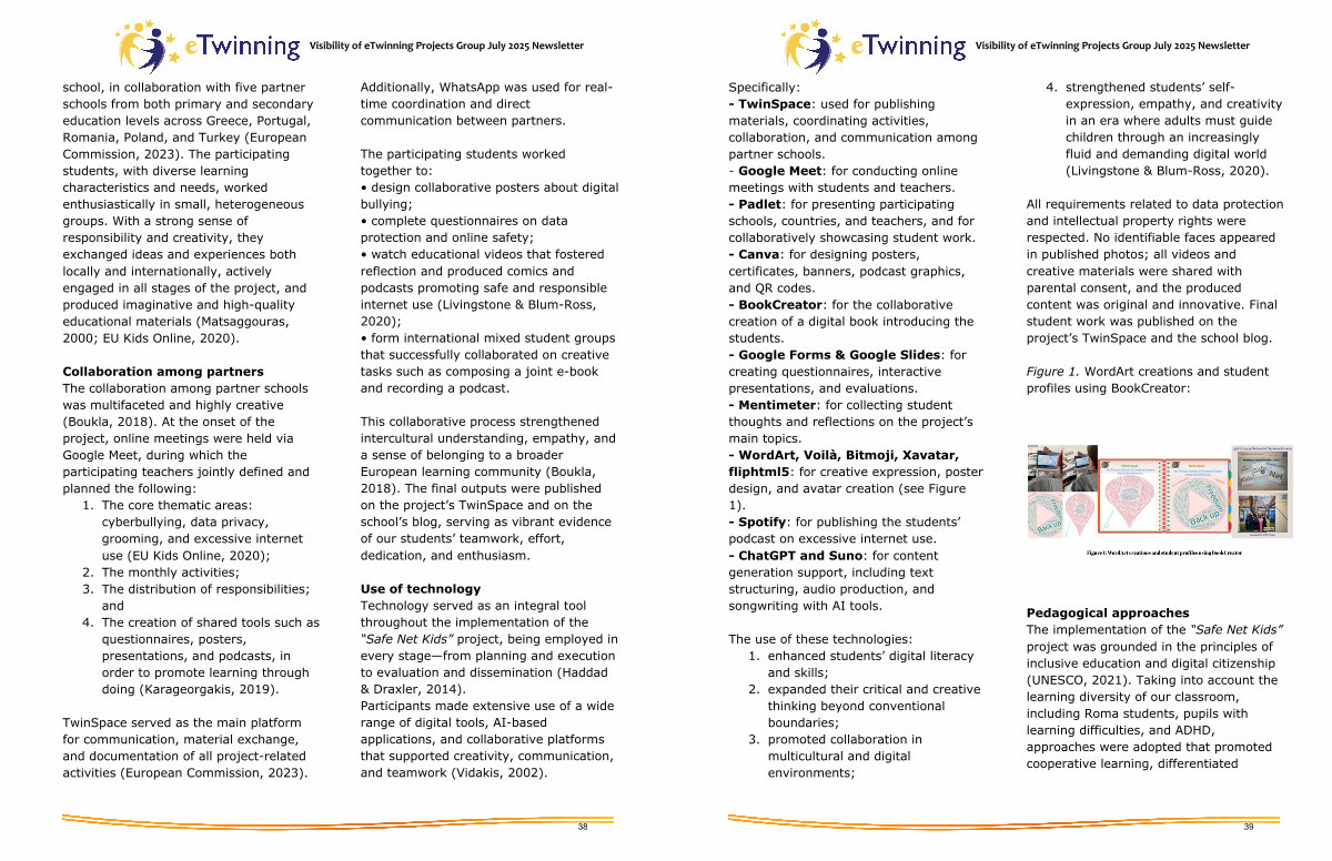Visibility of eTwinning Projects Group July 2025 Newsletter school, in collaboration with five partner schools from both primary and secondary education levels across Greece, Portugal, Romania, Poland, and Turkey( European Commission, 2023). The participating students, with diverse learning characteristics and needs, worked enthusiastically in small, heterogeneous groups. With a strong sense of responsibility and creativity, they exchanged ideas and experiences both locally and internationally, actively engaged in all stages of the project, and produced imaginative and high-quality educational materials( Matsaggouras, 2000; EU Kids Online, 2020).