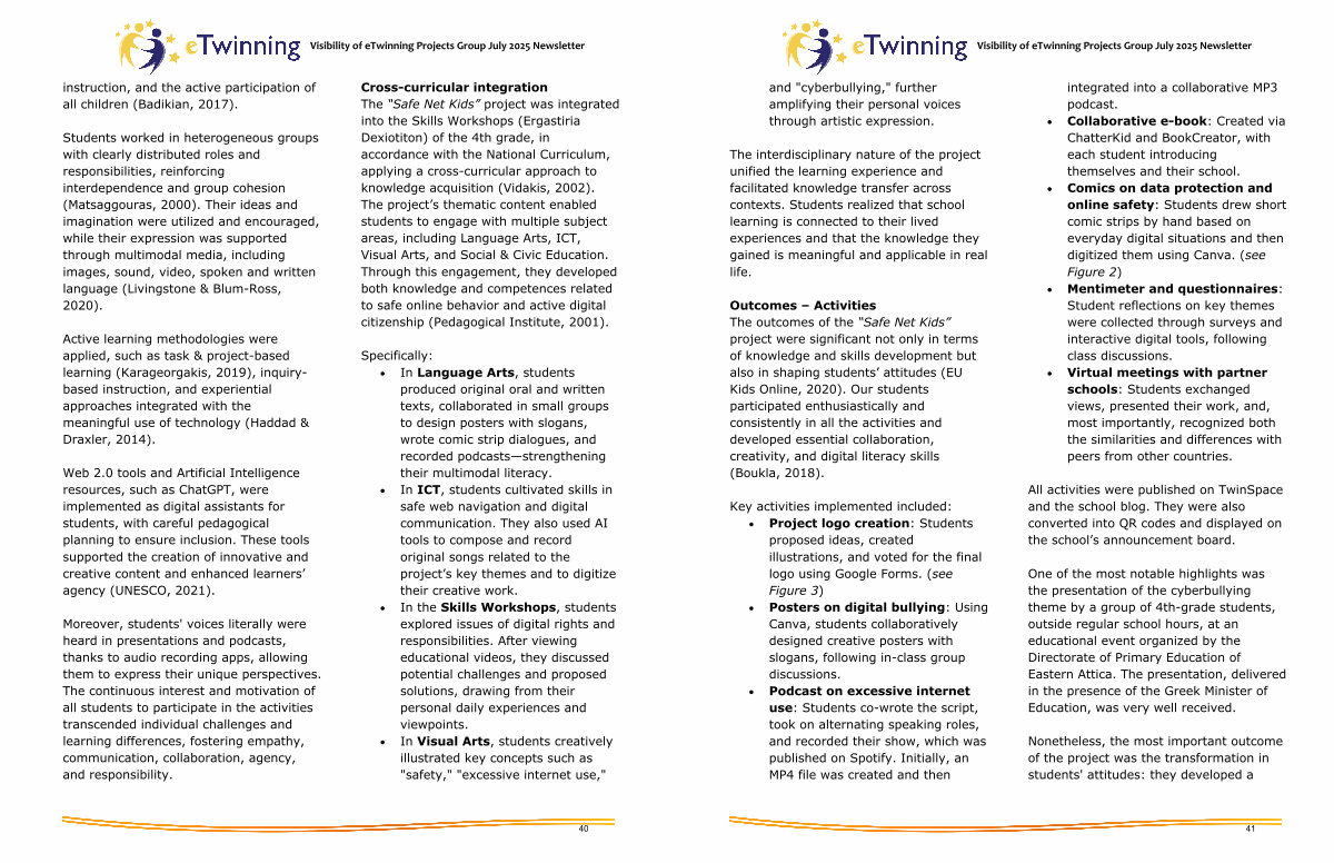 Cross-curricular integration The“ Safe Net Kids” project was integrated into the Skills Workshops( Ergastiria Dexiotiton) of the 4th grade, in accordance with the National Curriculum, applying a cross-curricular approach to knowledge acquisition( Vidakis, 2002). The project’ s thematic content enabled students to engage with multiple subject areas, including Language Arts, ICT, Visual Arts, and Social & Civic Education. Through this engagement, they developed both knowledge and competences related to safe online behavior and active digital citizenship( Pedagogical Institute, 2001).