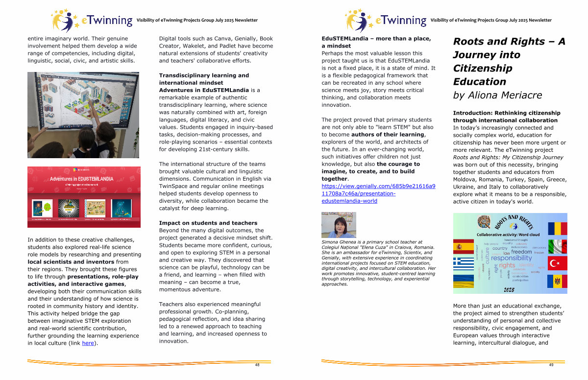 Introduction: Rethinking citizenship through international collaboration In today’ s increasingly connected and socially complex world, education for citizenship has never been more urgent or more relevant. The eTwinning project Roots and Rights: My Citizenship Journey was born out of this necessity, bringing together students and educators from Moldova, Romania, Turkey, Spain, Greece, Ukraine, and Italy to collaboratively explore what it means to be a responsible, active citizen in today ' s world.